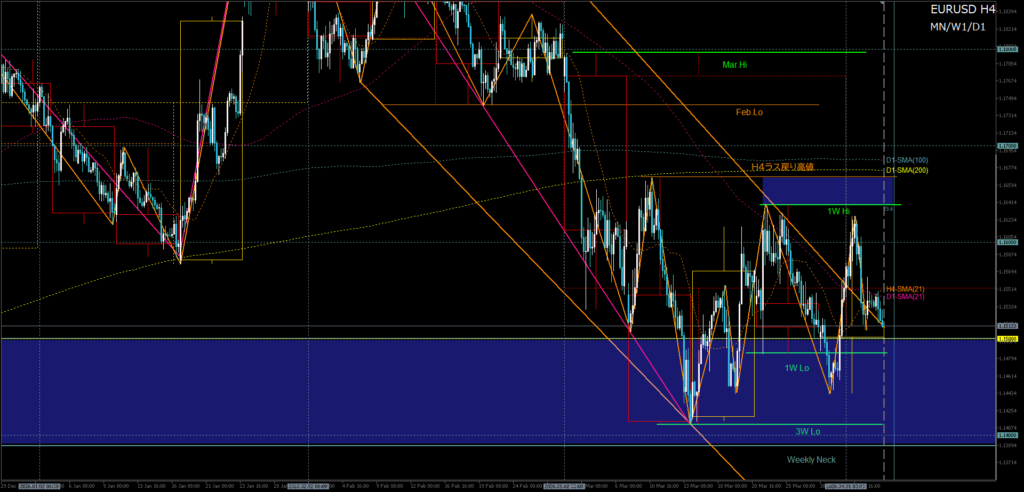 - H8ダブルボトム崩れ+H4二番底崩れ(1.150-先週安値)→3月安値ブレイク狙い