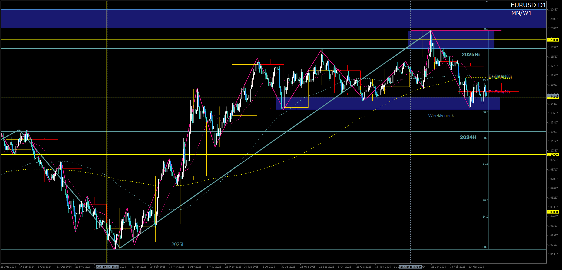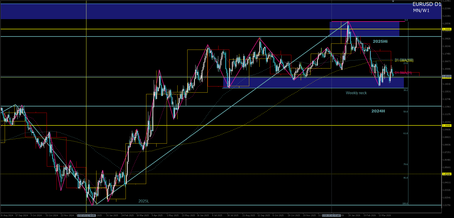 - D1大局構造:週足ネックゾーンでの攻防
