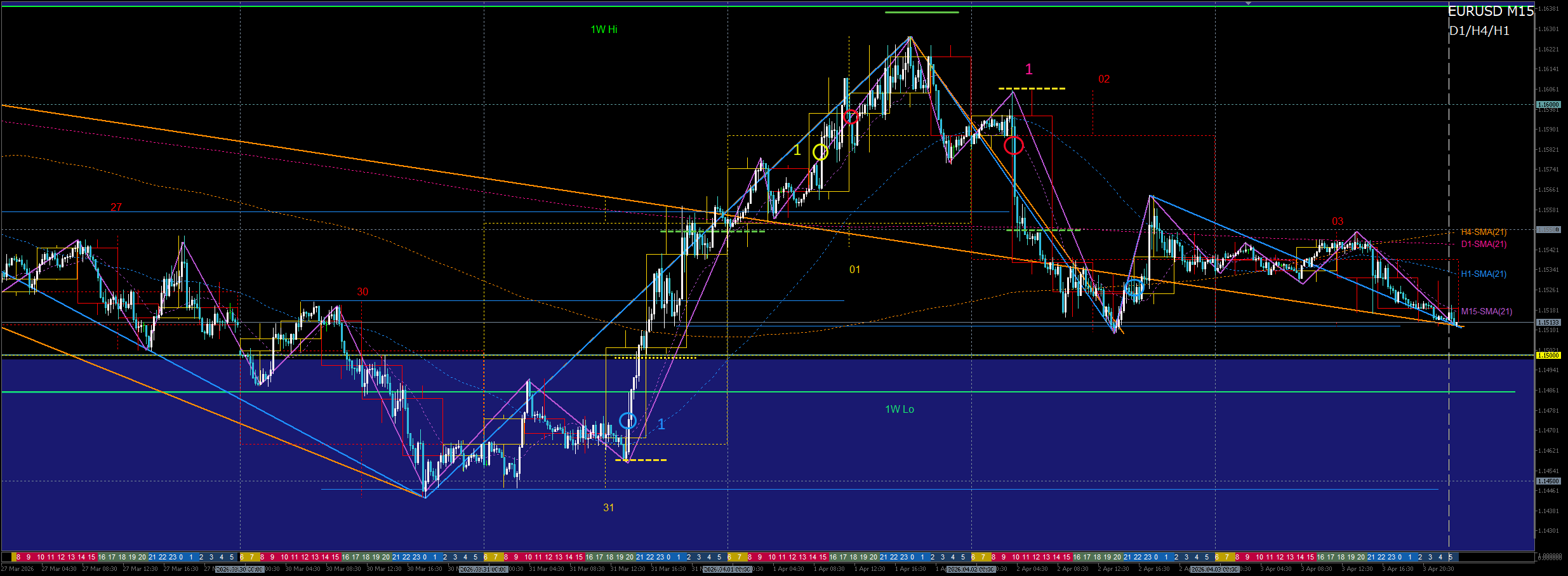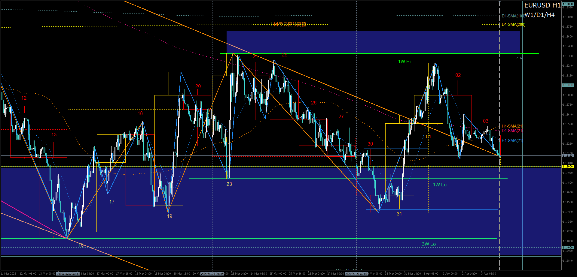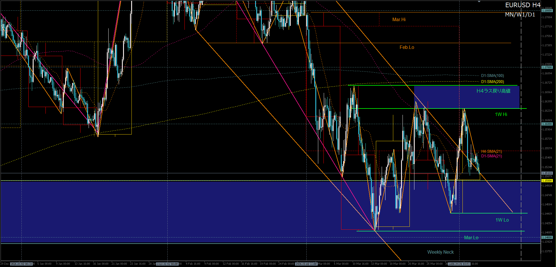 - H8ダブルボトム崩れ+H4二番底崩れ(1.150-先週安値)→3月安値ブレイク狙い