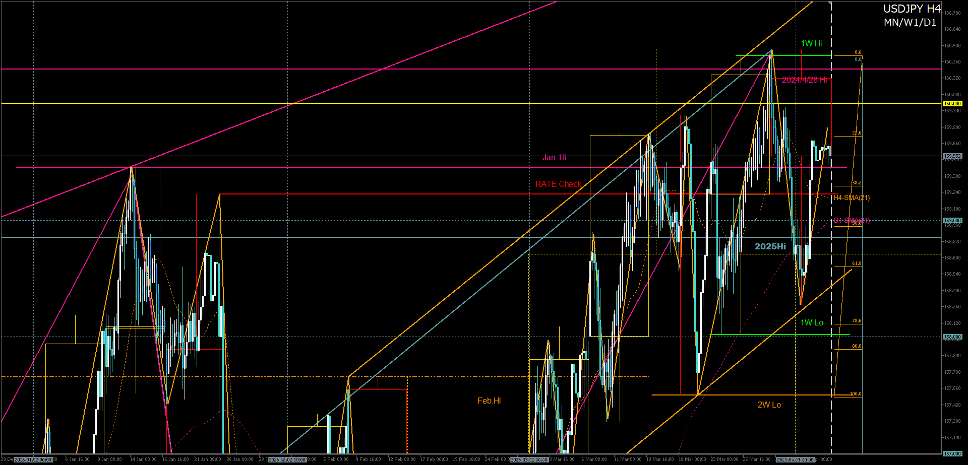 結果的に、160円とH4チャネルミドルに挟まれたレンジ相場となりました。
