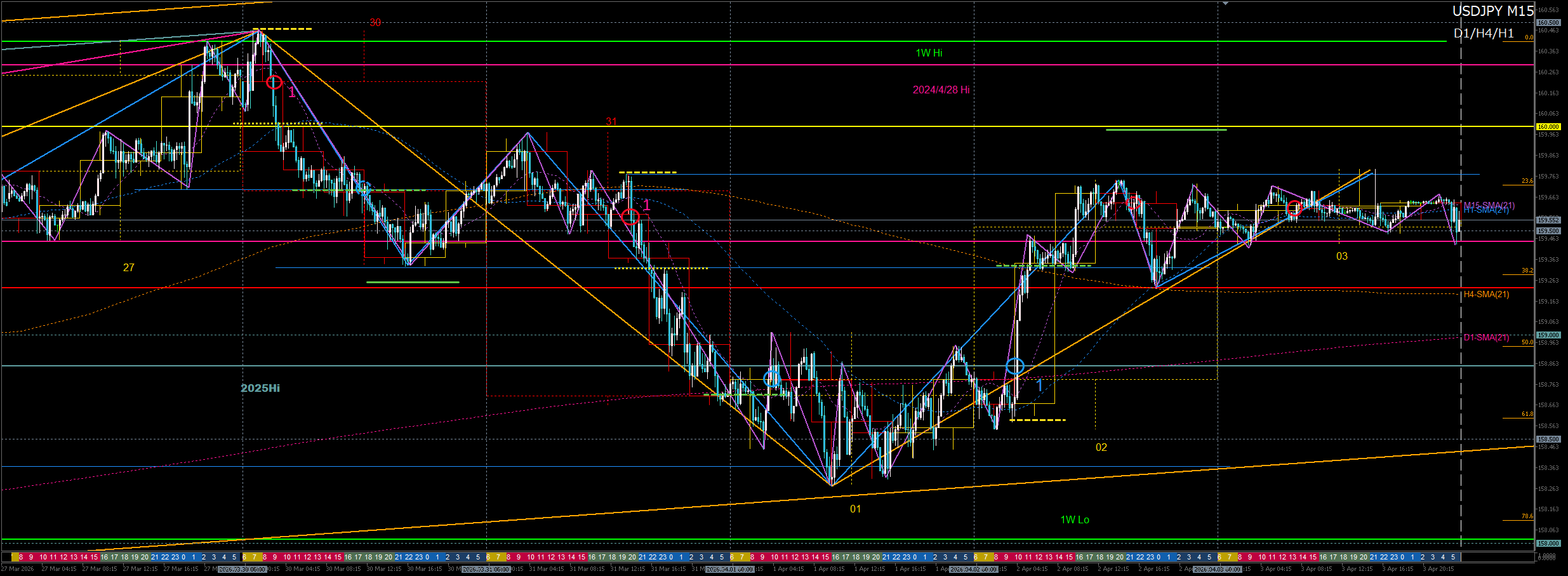 160円から利確調整狙いの逆張ショートが本命だけど、各時間足は揃って上昇トレンド構造継続中及びSMAPFOで安易に売れない展開。